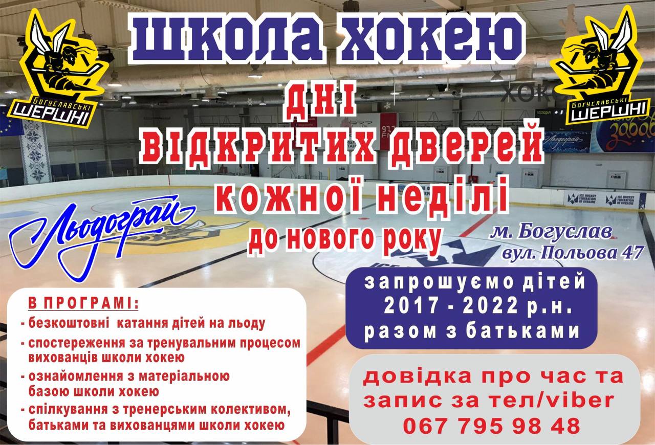 Хокейне дозвілля богуславського “Льодограю”. Ми продовжуємо знайомити вас із новими активностями цього універсального навчально-тренувального центру зимових видів спорту. Сьогодні розповідаємо про щотижневі Дні відкритих дверей для усіх охочих, аматорську команду хокеїстів старшого віку, про участь богуславських «Шершнів» у Чемпіонатах України, а також про безкоштовні пробні заняття з клюшкою та шайбою для наймолодших відвідувачів. Детальніше про всі ці хокейні «ноу-хау» Льодограю та про те, чим же вони цікаві для дітей і дорослих – слухайте далі: